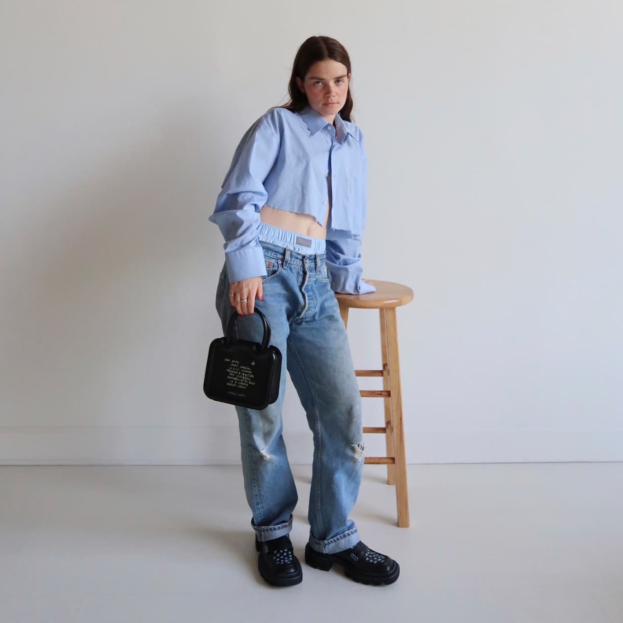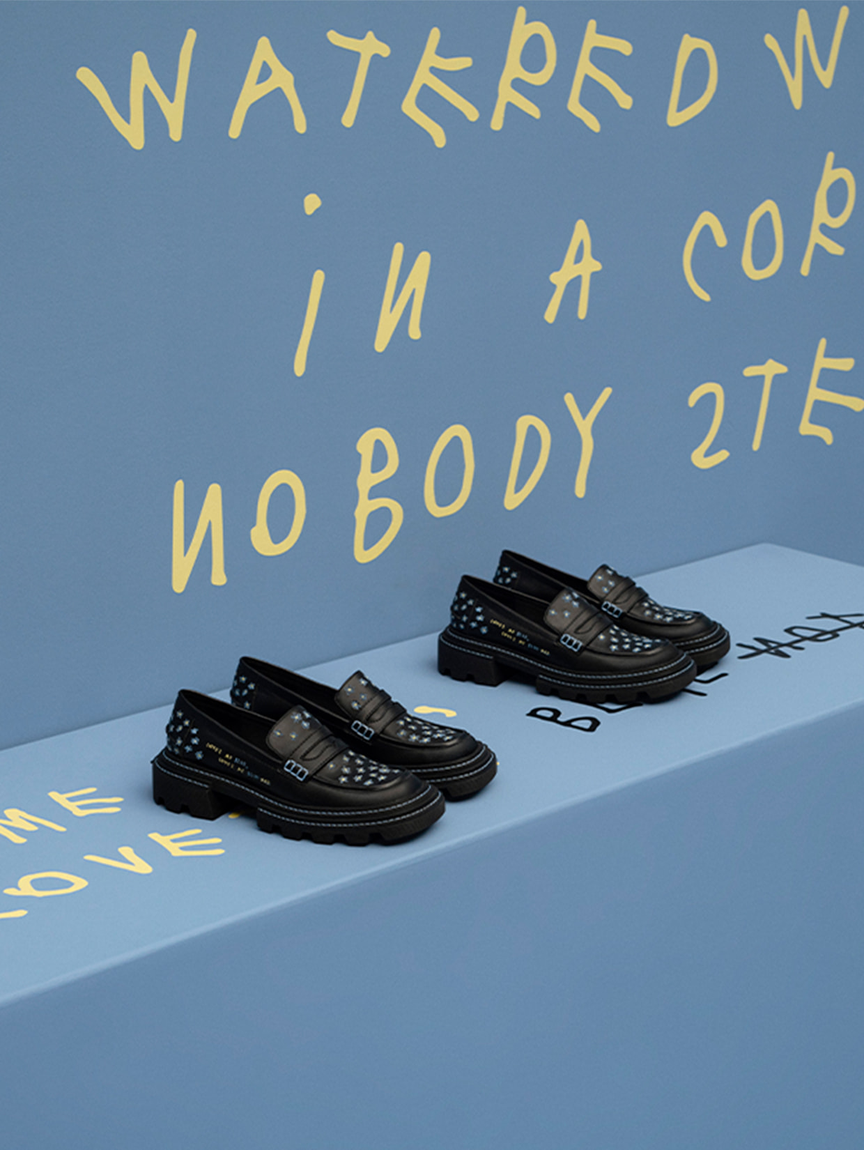 Believing that “words can transcend cultures and give us a glimmer of hope for brighter times”, Coco Capitán’s work has an innocent, child-like quality that is charming and playful, yet unexpectedly profound. Decorated with stitched-on blue daisies — as well as the words, “Loves Me Blue, Love Me Blue Not.” — the Perline Penny Loafers take on a whimsical new life.