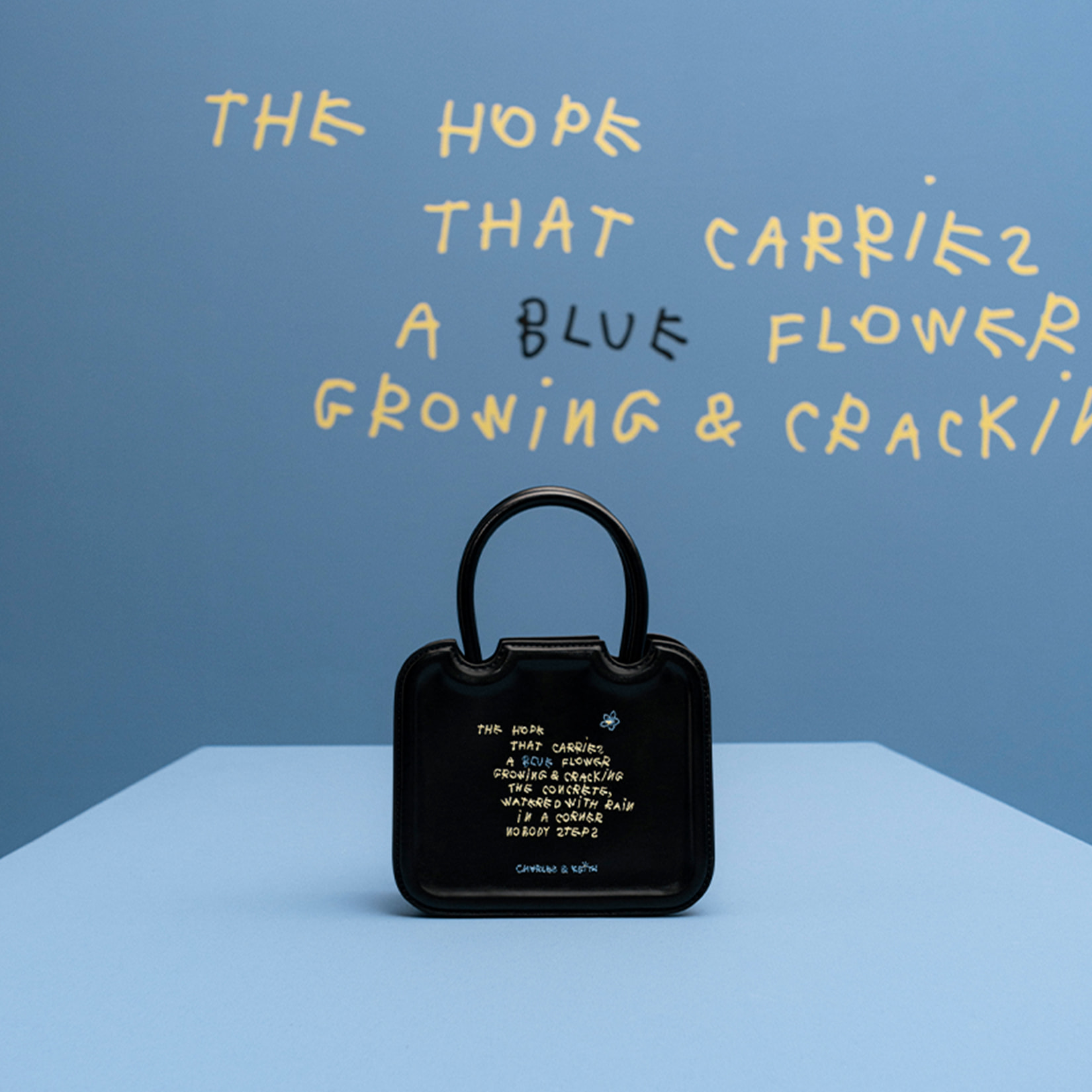 Coco Capitán’s art is inspired by “overheard conversations, diary entries, and sudden waves of introspection”. Embroidered with the artist’s distinctive handwriting, the Double Handle Sculptural Tote Bag tells a hopeful tale of a solitary blue flower growing and blooming through concrete.
